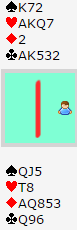 Hvis det gjøres med det samme risikeres at vest trumfer over. Jeg valgte en løsning som visstnok gir noe over 70% sjanse (så lenge trumfen sitter 3-2). Det er å ta for kløver dame og ess, så ta en hjerterhonnør til før hjerter 7 trumfes. Da vinnes med hjerteren 4-3, men også om hjerter sitter 5-2 og han med dobbelton hjerter har bare to trumf. Uheldigvis var ikke denne spilleplanen vinnende: