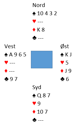 Om ikke det enkle og greie valget sparfinesse er det man går for handler det om å gjette hvem som har sparlengde. Syd kan skvises i spar og hjerter, men om nord har fire spar kan han også skvises, og det på en elegant måte. La oss flytte over en spar til nord og la syd ha spar dame i det fullstendige diagrammet over og se hva som skjer.