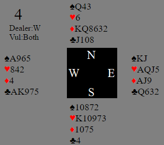 Her var det storeslem på gang! Øst åpnet, og overalt kom nord med i meldingene, flere steder med en sperremelding. Idet øst viser revershånd (for eksempel etter 1 rutersvar fra vest) får vest enorme kort. En eventuell slik meldesituasjon kan du diskutere med din faste makker. Hvis dere ikke finner slem i det hele tatt blir det "katastrofe"-spill, kun tre av 53 lag var bare i utgang. Selv om det spilles lilleslem kan godt spillet tapes om det spilles i en turnering som NEC-Cup. Det ble meldt storeslem ved 17 bord, de resterende 33 Ø/V-parene spilte lilleslem. Scorene varierte fra +100 N/S (ett Ø/V-par hadde en splintermisforståelse og spilte ruterkontrakt!), via utgang, lilleslemmer i kløver og hjerter (noen var doblet) til +1440 Ø/V i 7 kløver. Storeslem i kløver er overlegent bedre enn 7 hjerter hvor man blir avhengig av at hjerteren ikke sitter skjevt. Lederlagets Bareket-Lengy tok toppen. De var heldige da de meldte storeslem med den litt farligere trumfen, hjerter. Da N/S doblet 7 hjerter ble det den uvanlige scoren +1770!