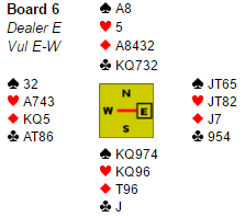 På kløver 2 fra nord måtte øst holde sine majorkort og kastet ruter 7. Det er en slags strip-squeeze fulgt av innspill. Idet øst kastet ruter ble ruter ess innkassert og tok bort øst siste kort i den fargen (frikort om ikke ruter ess spilles). Så fulgte tre runder spar fra topp og en fjerde spar til øst som med to kort igjen måtte spille hjerter slik at finessen med nieren kunne tas, og det ga det niende stikket.