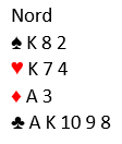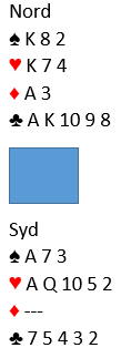 Å spille motspill mot 2 hjerter doblet ville vært å foretrekke fremfor slik det ble, motparten "off the hook" da jeg sa 2 ruter . Ved det andre bordet ble det spilt 2 hjerter doblet -500 som nesten var det minste N/S kunne få, og øst skal ikke gjøre mye galt i den kontrakten før han går 800 ned. Motparten vår var kommet seg unna og kontrakten ble 3 grand av nord. Øst spilte ut hjerter knekt til kongen, og vest gikk nesten i koma (5 minutter) før han stakk med esset. Det var nok ikke det beste, hvis han legger lavt ser det veldig vanskelig ut å vinne 3 grand. Inne på hjerter ess gikk vest i tenkeboksen igjen før han skiftet til kløver ess. Det er i alle fall bedre motspill enn liten kløver som sikkert var et alternativ for han (husk han ser ikke nords kort, bare knekten singel i kløver hos syd). Med liten kløver i skift vinner knekten stikket, og da er det bare å gi bort et par ruterstikk. Konge-dame i kløver er behagelige stoppere. Etter kløver ess kom kløver 6 fra vest. Da innså jeg at det ikke ville føre frem å gå for ruterfargen lenger, for forsvaret vil rekke få to kløverstikk som sammen med to ruterstikk og hjerter ess gir beten. Så jeg la kløver 7, og øst vant stikket før han fortsatte med kløver. Dermed var det tre kløverstikk hos nord som sammen med tre sparstikk, ett i hjerter og ruter ess er åtte stikk. Og nå var øst i trøbbel. På den fjerde kløveren kunne han kaste en hjerter, men idet den siste kløveren kom fra nord så det slik ut: