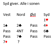 Syds 4 ruter viste kortfarge, kløvertilpasning og en god hånd, 4NT var Key-Card Blackwood, og 6 kløver viste to Key Cards (essene og trumf konge). Det var nok til at nord satset på 7 kløver i god tro på at syd har en bra hjerterfarge. Så kom overraskende vest med en gang til etter at ingen hadde hørt noe fra ham siden meldingene var på ett-trinnet! Hva skulle nord gjøre nå? Det er klart 7 grand kan være nedlegg om syds hjerter er god nok, men er det noe sånt som A-Q femte han har i hjerter er det fare for at den fargen kan sitte 4-1, og i så fall er ikke 7 grand tingen. Harald Berre Skjæran valgte å kravpasse som en invitt til 7 grand. Etterpå omtalte han sin egen melding som litt for forsiktig. Og slik kortene så ut hadde de faktisk 7 grand i kortene, men sannelig en uvanlig 7 grand med kun 27 hp til sammen! .