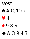 Hvis det spilles med alternativ 1. har ikke vest noen god melding nå. Han vet bare at makkeren har minst fire hjerter, og å melde kan føre helt galt av sted.
