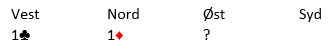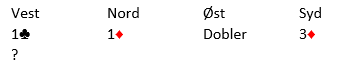 La meg eksemplifisere problemet som kan oppstå, men som løses greit ved at svarhånden i denne meldesituasjonen viser begge sine majorfarger med en melding - dobler. (eksempelet er fra en turnering forleden)