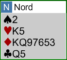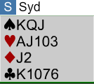 Her har svarhånden en dårlig sparfarge, og han bør ikke satse på 3 grand. Han melder 4 ruter over 3 spar og sier med det at 3 grand skal vi i hvertfall ikke spille. Slik ser N/S sine kort ut med den åpningshånden: