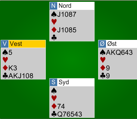 Syd spiller AKQ i kløver ut, og vrir i fjerde stikk over til ruter. Jeg tar for spardama, og syd kommer seilende med knekten. Så nå spiller du.......