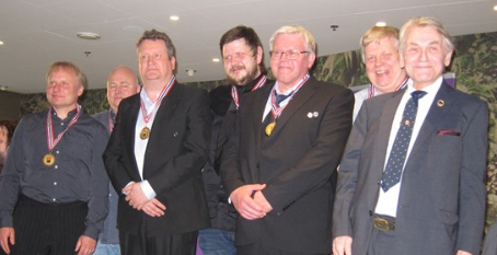 Vinnerlaget: Sigurd Evjen, Tormod Røren, Øivind Saur, Erik Eide, Vidar Smith og Jon Aabye sammen med en annen mester, Jon Sveindal.