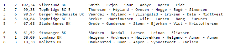 Lagfinalen var veldig bra på alle måter. Mathias Beyer fortjener ros for en fremragende bulletin. Mange andre fortjener gode ord, og dette er vel akkurat der hvor man nevner forskjellige, så blir en eller annen som fortjente masse ros glemt. Men jeg prøver likevel, for det er tydlig at klubben hadde forberedt seg godt med leder Helge Vaardal, klubbformann Hilde Anita Larsen i spissen, og selvsagt Liv Bugge som har postet masse fine bilder, og dessuten gjort alt mulig annet også. Per Norland hadde som vanlig full kontroll på turneringsledelse og regnskap, og de som bidro til gjennomføringen av overføringene til BBO skal også har masse ros. Andre har selvsagt også bidratt til det fine arrangementet, men ingen (flere) nevnt), ingen glemt!