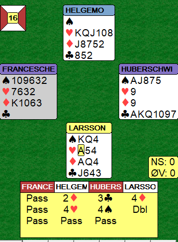 Med nord (Helgemo) som giver og Ø/V i sonen åpnet Helgemo med 2 ruter som viste en svak 2 åpning i en majorfarge. Øst gikk inn med 3 kløver, og Larsson sa 4 ruter som ba Helgemo om å melde fargen sin. Nord sa 4 hjerter, og øst meldte 4 spar som syd doblet. Hun spilte ut hjerter ess som stod, altså visste hun at Helgemo bare hadde femkorts farge. Hva ville du gjort i andre stikk?