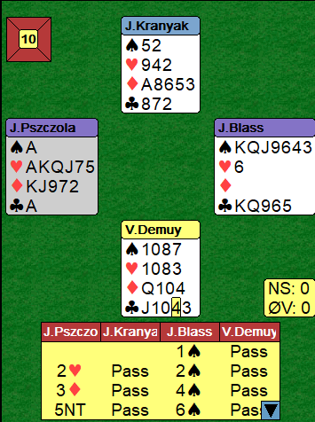 Det er ikke så lett å melde disse kortene med 100% styring. Toppkontrakten er 7 spar, men mange fant ikke ut av det og spilte lilleslem. Den må spilles i spar, for med hjerter ut mot for eksempel 6 hjerter blir det nitrist, østs hånd er verdiløs! I sparkontrakt er det tretten enkle stikk. Omtrent ved halvparten av bordene ble storeslem meldt og vunnet. Ved noen få bord var det mislykkede hjerterkontrakter med bet, resten spilte 6 spar.