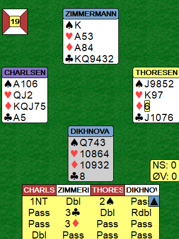 Ø/V har 2-3 spar i kortene, og da Zimmermann meldte en gang til etter at Thoresen hadde flyttet fra 1 grand til 2 spar viste ikke det norske paret noen nåde. Motspillet satt vel ikke helt hundre prosent, men det ble likevel +500 og en skyhøy score.