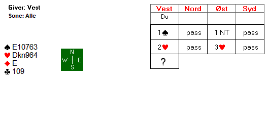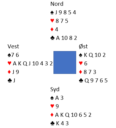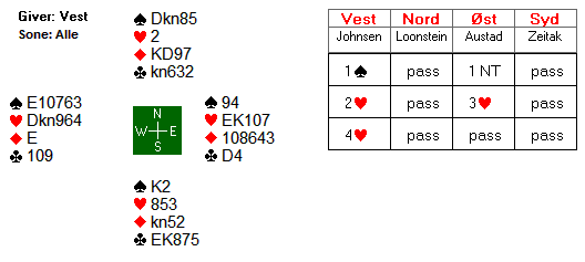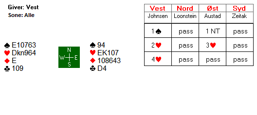I kløver og hjerter er det til sammen fire tapere på vests hånd, men det er ikke usannsynlig at øst kan dekke opp for to av disse. Christian Fredrik så stort potensial i kortene og ville ikke risikere å gå glipp av utgangsbonus. Han høynet ganske så momentant til 4 hjerter.
