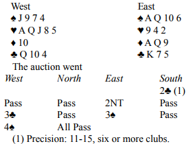 Nå er det tvilsom om 3 NT kan stå. Motparten tar normalt stikk i begge de to sorte fargene samt 3-4 stikk i hjerter. Pass eller meld eventuelt 3 spar som makker løfter med honør minst dobbel.