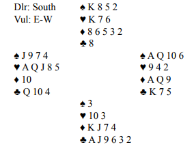 Flemming åpneti 2. hånd og ugunstig sone med 1 kløver og Ove svarte 1 spar. Nå hoppet Vest til 3 ruter, splinter som viser max singelton og god støtte i makkers farge. Dermed startet kontrollmeldinger, 3 hj (= A eller K eller kortfarge) fra Øst, 4 kl fra Vest og 4 hjerter fra Øst. På 4 NT fra Johnsen svarte Gundersen 5 spar som viser 2 (av 5, sp K?= ess) samt sp D – eller ekstra lengde i trumf. Da alle 5 keycard er påvist å ha kan spørrehånd med 5 NT få greie på konger. Vanlig da er å vise ekte konger og med to kunne hoppe til 7- trinnet i trumf. For 5 NT vil også være en storeslemsinvitt. Men så sterk er ikke Johnsen, han har alt strukket seg og Flemming gikk derfor direkte til 6 spar.