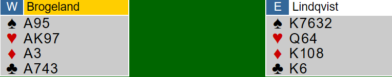 Da Lindqvist åpnet med østs kort var de ganske raskt i 6 spar som er en glimrende kontrakt. Den er kun avhengig av at trumfen sitter 3-2, en 68% sjanse. Men spar satt skjevt, for sikkerhets skyld 5-0. Uheldig, men ofte uavgjort spill. Ved det andre bordet doblet imidlerti N/S 4 spar som ble vunnet med ti stikk, 590 og 12 IMP til lag NAMBAWAN.