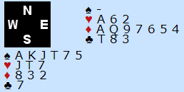 Syd for Frankrike åpnet med 2 spar som var spar + en minor. Nå meldte nord dårlig etter min mening da han sa 3 ruter som viste minst invitt med sparstøtte. De fleste mener 4 spar er riktig melding med det samme for å ta bort rom for Ø/V hvis øst har en vanskelig hånd. Men sier nord 4 spar så melder øst med disse koretene 4 grand (to farger), og de finner 5 ruter. Over 3 ruter valgte jeg å si 3 hjerter, og tanken var å melde ruter neste gang da det neppe går pass rundt på 3 hjerter. Makker meldte 3 grand på vests plass, og nord passet. Jeg tok ut i 4 ruter som må vise en veldig ubalansert hånd. Vest meldte 4 hjerter, og nå kom nord med og sa 4 spar. Jeg har en veldig spillesterk hånd, men vet ikke sikkert om vi har god tilpasning i noen farge, vest kan vel godt ha 4-2-2-5 fordeling for eksempel. Så jeg passet og overlot avgjørelsen til makker. Han burde nok sagt 5 ruter selv om han føler seg nokså sikker på at 4 spar vil gå bet. Å melde 5 ruter vil fra hans ssynspunkt trolig føre til utgang inn i sonen (vests to røde honnører må være gullkantede). Men han doblet.