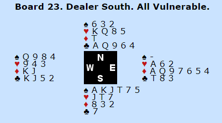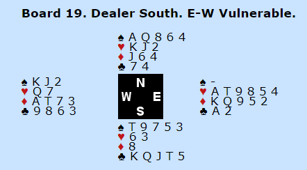 4 spar kan betes, men da må motspillet gå hjerter ut og hjerter tilbake. Da har ikke syd noe inntak til å dobbelfiske trumfen, og vest kan få seg en stjeling med en tredje runde hjerter fra øst. Men jeg trodde ikke makker hadde fire ruter og skiftet til ruter konge. Da var det for sent, syd hadde fått muligheten til å stjele seg over til syd to ganger og dobbelfiske vests spar. Pluss 590 til Frankrike og 15 IMP til den da derers Ø/V-par spilte 5 ruter med elleve stikk.