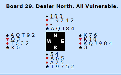 Bulgarias Ø/V meldte og støttet ruter før de havnet i 4 spar. Nord spilte ut hjerter 10 til syds ess. Nå må syd ha hatt en slags "brain-lapse" da han ikke så at det opplagte motspillet er ruter ess og ruter til stjeling - han jo vet at den skjulte hånden har rutertilpasning.