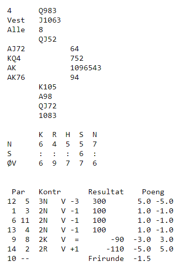 Resultater vil bli oppdatert her: http://bridge.no/var/ruter/html/9901/2017-09-22-24nmpar.htm
