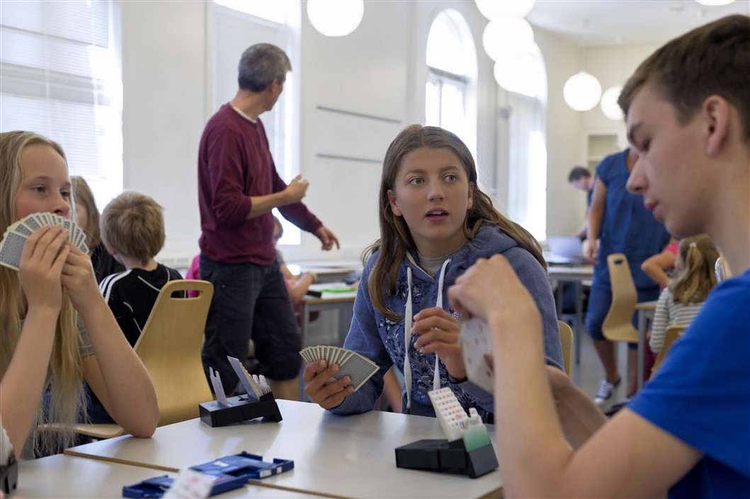 Egersund starter juniorbridgeklubb neste fredag. Her fra besøket på Eigerøy Skole i juni 2017. Egersund har ingen foreldre involvert, men tidligere rektor ved skolen Ruth Hope, er bridgespiller og initiativtaker.