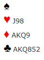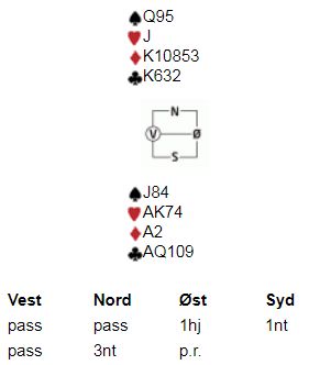 Vest spilte ut hj 2 (norske) til knekten og damen som fikk beholde stikket. Ny hjerter gikk til esset med avkast av en spar i bordet.