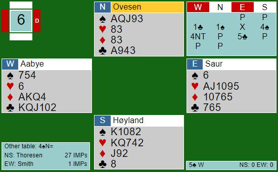 Ved begge bord doblet øst over nords 1 spar innmelding, en god avgjørelse med så fin fordeling til tross for kun 5HP. Jon Aabye satset da på at det var minortilpasning i hvert fall i en av fargene og viste begge minor med 4 grand. Og Ø/V sine kort passet perfekt sammen, men det bør nok bli bet i utgangen da spillefører med beste motspill ikke kan få trumfet to spar. Men kontrakten føk hjem, en massiv +600 til lag SMITH.