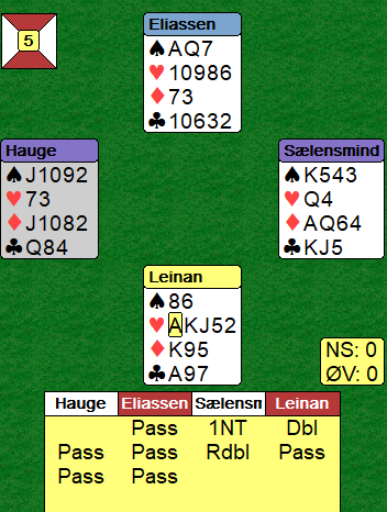 Jeg kjenner heller ikke her Ø/V sine avtaler i detalj. Kanskje er redoblingen obligatorisk og så er det opp til vest? Eller kanskje mente Sælensminde sin redobling som «meld en farge, makker», men Hauge ville la sin glimrende makker prøve seg i 1 grand redoblet.