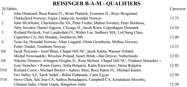 Laget Boye Brogeland og Espen Lindqvist spiller på i det amerikanske høstmesterskapet tok ledelsen etter kvalifiseringen i Reisinger, den mest prestisjetunge turneringen under Fall Nationals. Lagkamerante deres på firemannslaget er amerikanerne John Diamond og Brian Platnick.