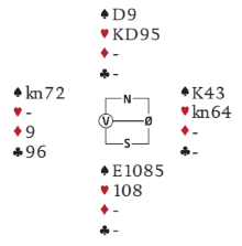 Vest spilte ut kløver konge til esset. En trumf til nord avslørte at øst skulle ha trumfstikk. Da så det unektelig ikke lyst ut, hvordan skulle han kunne unngå en taper i hver farge? Espen spilte ruter konge til vests ess. Tilbake kom en ruter til damen. Nå forsøkte nordmannen liten spar til åtteren. Håpet var at øst la liten fra K-kn-x slik at syd kunne få lurt til seg det stikket, så kaste en spar fra nord senere på godspilt kløver knekt. Men dette lyktes ikke da hele spillet så slik ut: