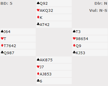 De fleste spilte 6 spar. Noen var i storeslem, bl.a. Butts og jeg. Etter at vi hadde funnet spartilpasningen spurte syd etter Key-Cards og sa 5 grand etterpå som lovte at alle nøkkelkortene var på plass. Da var det naturlig for nord å si 7 spar med så fine kort, masse stikk!