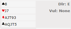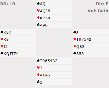 Det er tre muligheter: melde fire i en minorfarge (og da stå i fare for å melde den fargen makker ikke har tilpasning i), si 4 grand som begge minor (som er ganske hardt), eller gamble 3 grand! Jeg gikk for utgang og sa 4 grand. Da trauet kom tilbake gjennom skjermen var makkers melding temmelig overraskende: 6 grand! Noe måtte være galt, for hvorfor meldte hun ikke over 3 hjerter? Slik så hele spillet ut: