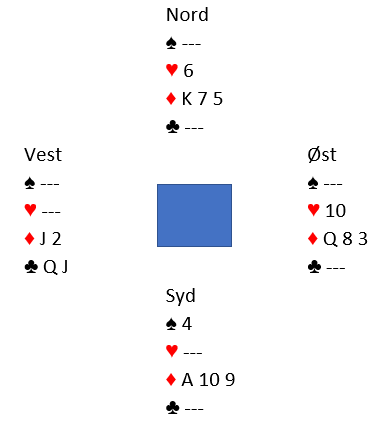 Sjansen hvis øst har hjerter konge er at han også har minst fem hjerter og minst tre ruter. Da er han overmoden for en skvis. Flytt hjerter konge over til østs hånd og se hva som skjer. Vest får sparstikket sitt, og spillefører tar altså for hjerter ess og spiller damen. Om øst har kongen dekker han kanskje, men om han gjør det eller ikke spiller ingen rolle. La oss si han dekker. Da tas alle sparstikkene, og siden han med hjerterholdet (for å holde et større kort enn nords fjerde hjerter) også har tre ruter blir han skviset sønder og sammen. Sluttposisjonen blir i så fall slik hvis altså hjerter konge bytter plass fra vest til øst):