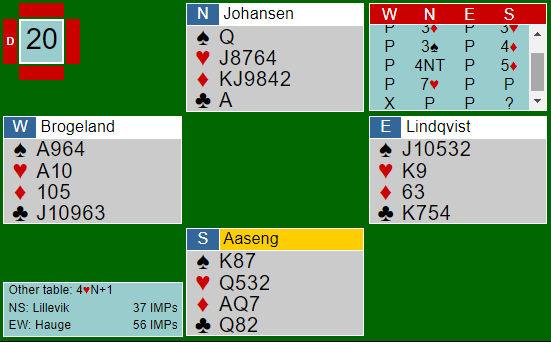 En kan kanskje diskutere syd meldinger også. Jeg tror at et godt prinsipp er at den som melder Stenberg som oftest bør melde 4 i majorfargen neste gang om han har minimum for 2NT-svaret. Og det har syd, flat fordeling er det også. Men syd likte nok ruterhonnørene sine mot makkerens ruterfarge, og da syd viste interesse ble nord litt for ivrig med sin fordelingshånd. Idet nord meldte 4NT er spillet ødelagt allerede da det er en bet i 5 hjerter. Da trauet kom tilbake til Brogeland og nord hadde meldt 7 hjerter mente han at nok var nok, og doblet med sine to ess. Lite visste han at også makkeren hadde ett stikk! Storeslem meldt frivillig med kun to av fem Keycards er vel en liten rekord, og det kostet da også fortjent -800.