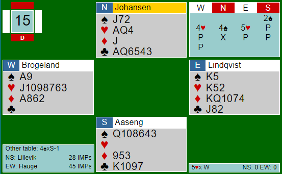Boye Brogeland og Espen Lindqvist er det ubestridte topp-paret av de norske parene som spiller mye internasjonalt. Når de sitter i flyten, og det er ikke sjelden, er det veldig tungt å spille mot dem. Her er et par spill hvor det meste gikk galt for motparten, og det var Tom Johansen og Lasse Aaseng som fikk juling i denne runden. Riktignok var det første eksempelet temmelig selvforskyldt, og et eksempel på hvor galt det kan gå om det bommes i Blackwood-situasjoner. Spillet førte til en av de største utbetalingene i helgen.