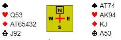 Trond doblet nords 2 ruter – Multi (enten en veldig sterk NT-hånd, eller en svake 2 åpning i hjerter eller spar). Baard Olav hoppet til 5 ruter, og Trond la på til slem. Spar konge kom ut, og ikke unaturlig ble det til at spillefører tok ruterfinesse etter damen over syd. Han med sekskorts majorfarge (nord) er favoritt til å ha kortfarge i ruter. Finessen røk imidlertid da nord dukket opp med damen, men det var langt fra over fortsatt. Et par spar ble trumfet hos vest underveis og idet alle trumfene ble tatt oppstod en slags tosidig skvis hvor nord har blitt alene om å holde spar, og syd må holde kløver siden han satt med K-Q i den fargen. Ingen av dem kan derfor holde fire hjerter til slutt. Skvis var imidlertid unødvendig denne gangen siden hjerteren satt 3-3 fra start. Å melde slemmen ga godt betalt, 12 IMP.
