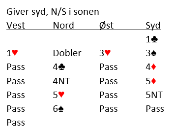 Tre ganger pass til Ove som åpnet forsiktig med 1 hjerter. Nord doblet nå opplysende (viser sparfarge samt kort å kunne kjempe om kontrakt på), og Anders passet. Syd meldte 2 kløver som logisk benekter sparlengde og nå hoppet Gundersen til 4 ruter. Etter pass fra Nord mannet så Fugleneb seg opp og meldte lilleslem- 6 ruter var de alene om å komme i.