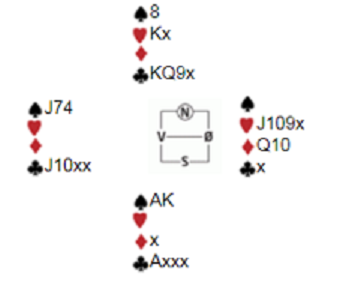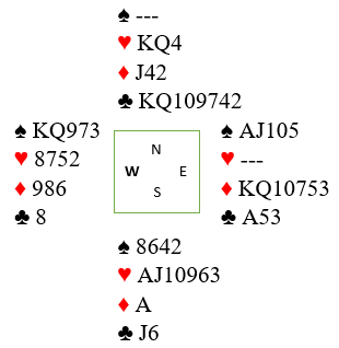 Ekstrem fordeling med såkalt dobbeltilpasning begge veier. N/S kan vinne 6 kløver og Ø/V kan vinne 6 spar! Men det går galt om det spilles med en av de to andre ni-korts tilpasningene, hjerter (N/S) og ruter (Ø/V), siden motspillerne kan få stjelestikk. Her er hva som skjedde ved det ene bordet hvor min informant var tilstede, og som han sa: "Her var det vel flere av oss som gjorde litt rare ting?":