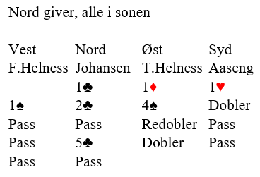 Johansen safet hjem elleve stikk selv om det var mulig å vinne ett doblet overstikk i 5 kløver. Ved det andre bordet var også kontrakten 5 kløver doblet, og der vant Wennevold-Helness tolv stikk for +950! Det ga 5 IMP til Topbridge 2, men spillet var kun et av noen få lyspunkt for det laget som måtte se seg kraftig slått av klubbkameratene sine.