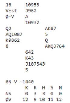 Det skjedde altså ved tre bord på Storefjell at sluttkontrakten ble 7 grand. Ved to av dem spilte syd ut spar. Da er det tolv sikre stikk, og siden syd har hjerter konge endte det med meldt og vunnet storeslem - litt ufortjent kan man si. To par delte altså toppen for +2220, det tredje paret som var i storeslem fikk ruter knekt i utspill til nords ess, og måtte finne seg i en ren bunn.