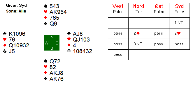 Vest spilte ut ruter 10 til syds knekt. Peter fortsatte med ruter ess, der øst kastet en kløver. Så fulgte kløver til damen og spar til Peters dame og vest stakk med kongen.