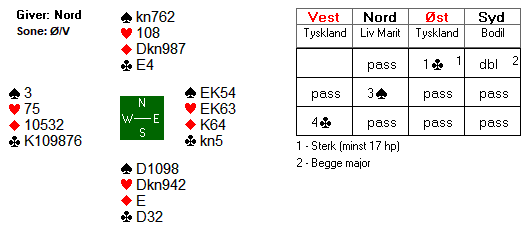 Jeg bakspilte Liv Marit Grude (nord) og Bodil Nyheim Øigarden i Norges kamp mot Tyskland. Her vant den tyske spilleføreren utspillet med kongen, og fortsatte med en kløver som gikk rundt til esset hos Liv Marit i nord. Hun fortsatte med hjerter 10. Spillefører vant med esset og seilte kløver knekt. Begge motstanderne fulgte farge. Deretter stjal hun seg inn i bordet i spar, tok for kløver konge, og fikk med det tatt ut syds siste trumf.