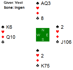 Her er slem godt spillbart øst-vest, men hvilken slem vil du helst være i? Det er dobbeltilpasning i hjerter og ruter, så det er kanskje mest nærliggende å havne i en av disse kontraktene, men 6 grand spilt av vest er faktisk den beste kontrakten. Da har man spar konge beskyttet i utspillet. Om ruteren løser seg med fem stikk, er kontrakten hjemme. Hvis det ikke går, må man skifte fot. Da må man spille på spar ess foran, og samtidig håpe at hjerteren er jevnt fordelt. I så fall er det tolv stikk (ett i spar, fem i hjerter, to i ruter og fire i kløver).