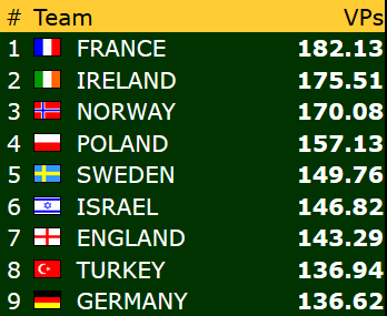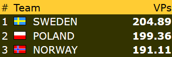 Veteranene gikk dessverre på sitt største tap så langt i turneringa med 10-38 mot mot Nederland. Dermed får de med seg 3,58 VP fra dagens andre kamp. Topp 3 i denne klassen ser slik ut: