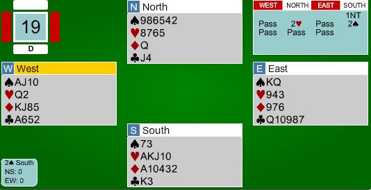 Hvis vest nå fortsetter i ruter, kan nord trumfe med hjerter konge og fri seg med en trumf, og motspillet får 4 hjerterstikk og spar ess. Vest forutså dette og spilte derfor spar først til øst sitt ess, som kunne gi vest enda en kløverstjeling. Nå var det tid for å spille ruter, og øst fikk trumfhøyningen sin på hjerter knekt for en beit.