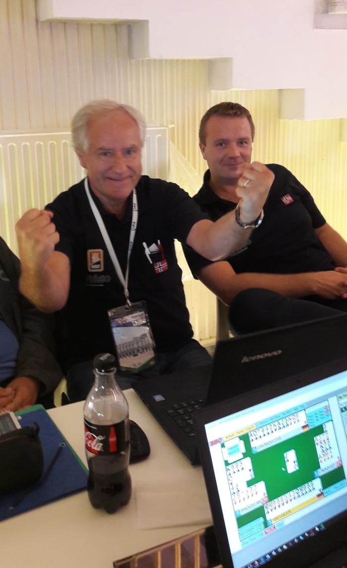 Vi kommer tilbake med mer stoff utover kvelden. Nå må vi haste videre til medaljeseremoni, som starter klokka 19.30. Tenk at Norge skal ropes opp ikke bare én, men to ganger. Dette er rett og slett en fantastisk dag for norsk bridge.