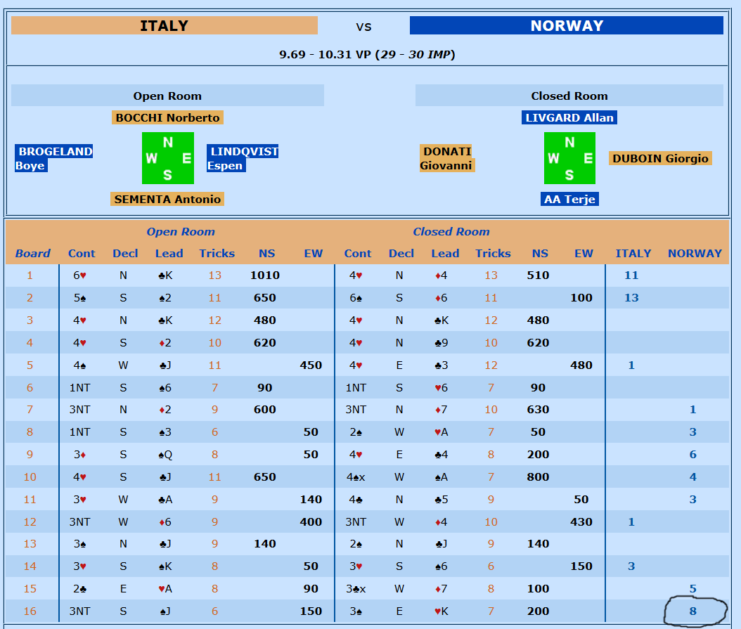 Som vi ser var altså Norge 7 IMP bak Italia før det siste spillet, mens Israel lå under med 15 IMP i sin kamp mot Ungarn.