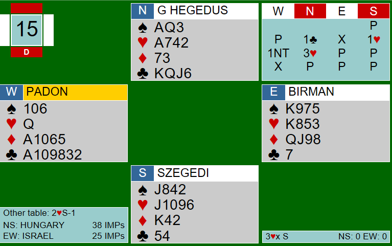 Mens isralerne hadde gått tre beit i 3 grand, på samme måte som italienerne mot Norge, stoppet Hegedus og Szegedi i 3 ruter for Ungarn. Her ble det hele elleve stikk etter at forsvaret kun fikk med seg spar ess og ett trumfstikk. 150 ved begge bord til Ungarn, og dermed 8 IMP til riktig lag!