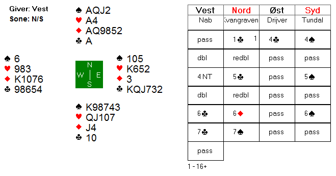 Bart Nab i vest prøvde å skremme Kvangraven-Tundal borte fra slem ved å doble både 4 og 5 spar (doblet utgang med overstikk gir mindre poeng enn slem), men de lot seg ikke lure. Da vest stampet i 7 kløver, meldte Nils 7 spar, og dermed kom de i samme kontrakt som åpent rom, men den store forskjellen var at kontrakten ble spilt av syd.