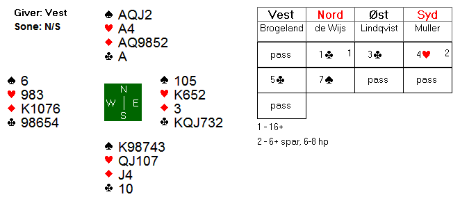 Simon de Wijs klinket til med 7 spar, etter at makker hadde vist 6+ spar og 6-8 hp. Espen spilte ut kløver konge til nords ess, som fortsatte med to runder trumf.