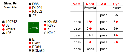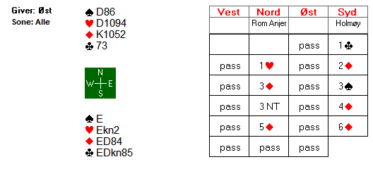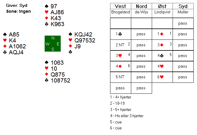 Boye og Espen endte i 6 hjerter etter at Boye hadde vist 18-19 med Hx eller 3 korts hjerter. Som man kan se, er kontrakten ganske dårlig da man må løse trumffargen K4 mot Q97532 med bare 1 taper. 6 spar er en mye bedre kontrakt, og trenger bare majorfargene 3-2, med et par tilleggssjanser. I 6 hjerter måtte syd ha esset dobbel i hjerter eller en av hendene J10 blokk. Slik satt det ikke, og dermed ble det 2 beit. Trøsten får være at også 6 spar går beit slik det sitter.